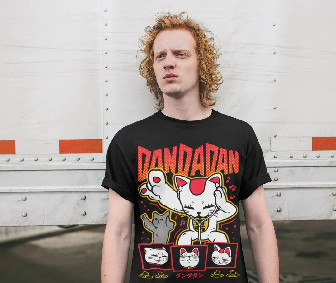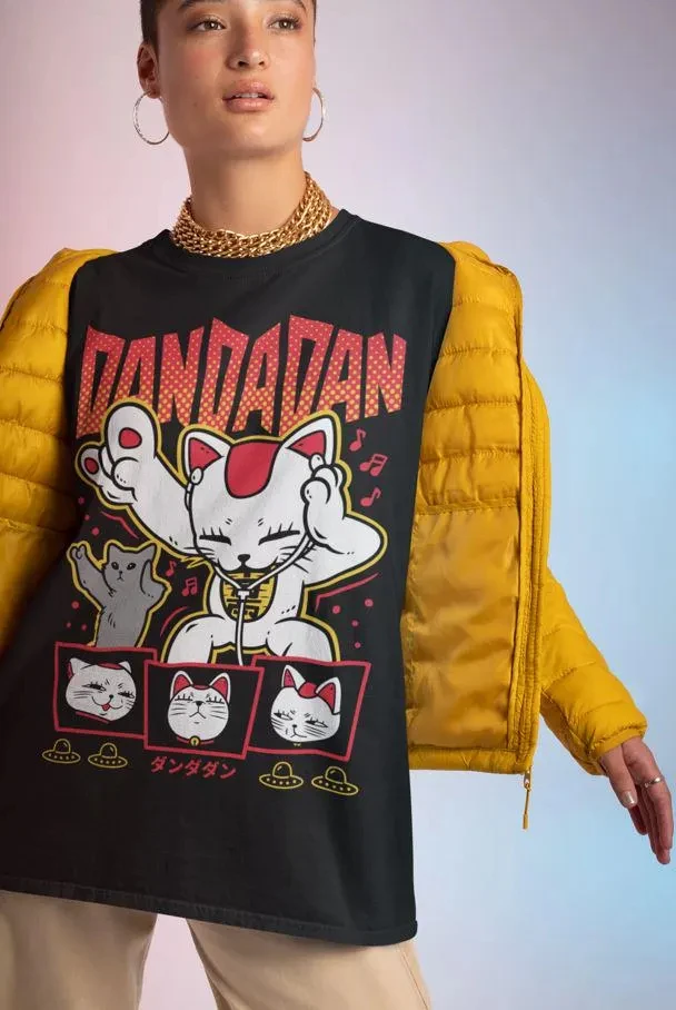 Dandadan: Maneki Neko Lucky Cat with Headphones Cotton T-shirt Street Style Casual Wear 2026 Summer Cute Graphic Tee