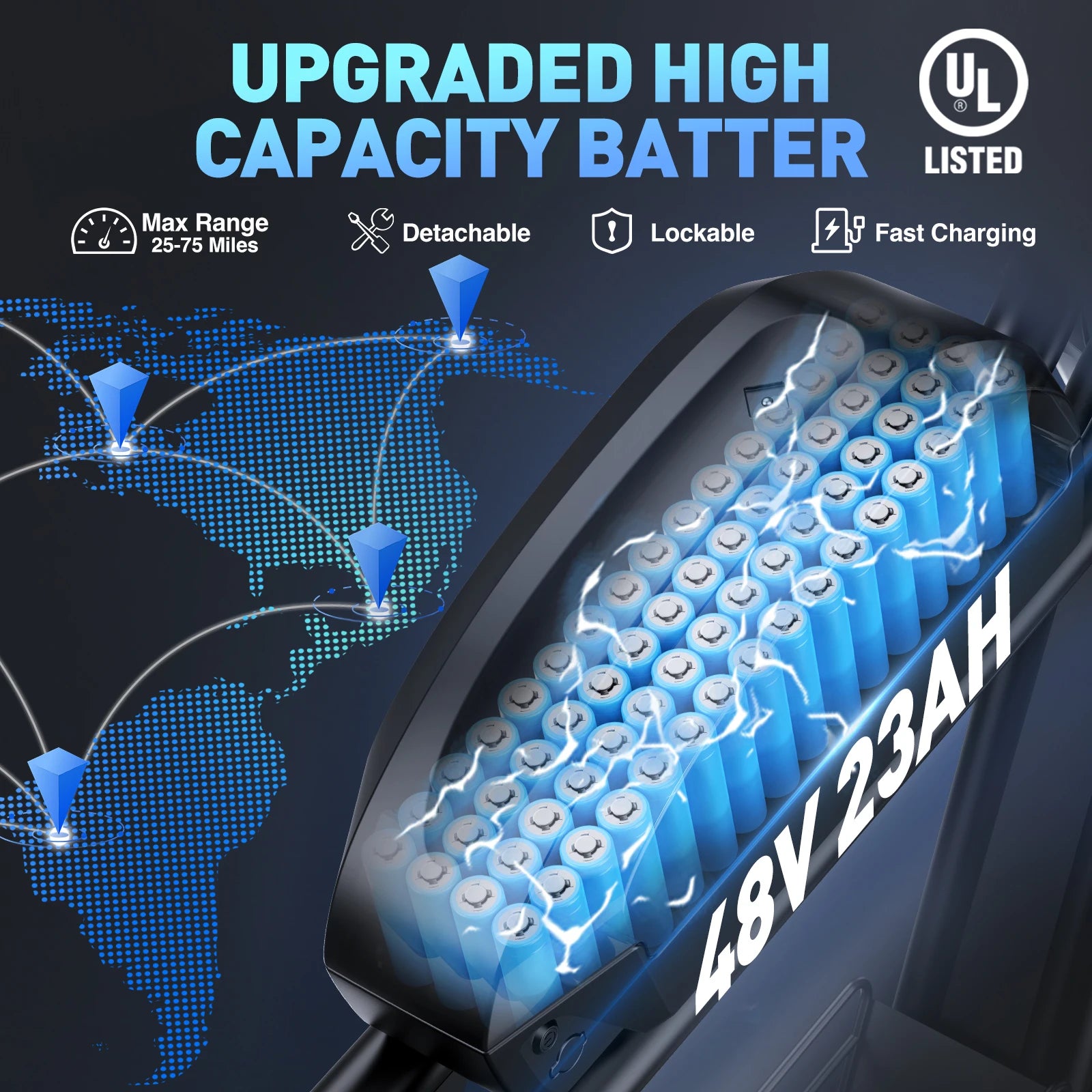 Prepare for an exhilarating ride with our e bike designed for adults. It is equipped with two robust Peak 1500W motor(total peak 3000W). With an impressive 90 Nm torque, it offers excellent climbing strength and effortlessly accelerates to a top speed of 35 MPH. Experience the freedom and excitement as you feel the wind in your hair, making every ride an adventure
