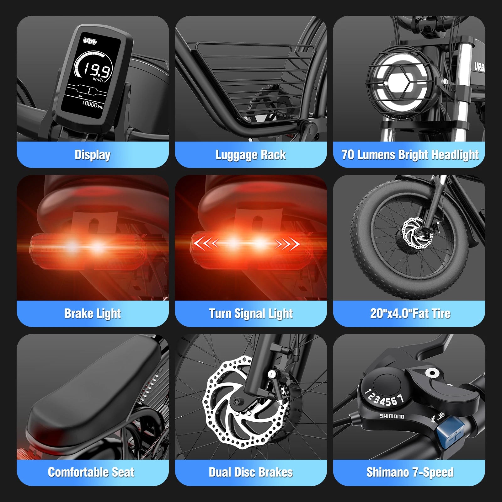 Enjoy a comfortable and smooth ride with the advanced front fork suspension and the extra-long seat, which effectively absorb most of the road bumps. The dual disc brakes provide excellent braking power on various road surfaces. Additional features such as powerful frontdaytime running light and brake light,rear turn signal light, anti-slip 20''x4.0 fat tires, a basket, all contribute to an enjoyable riding experience