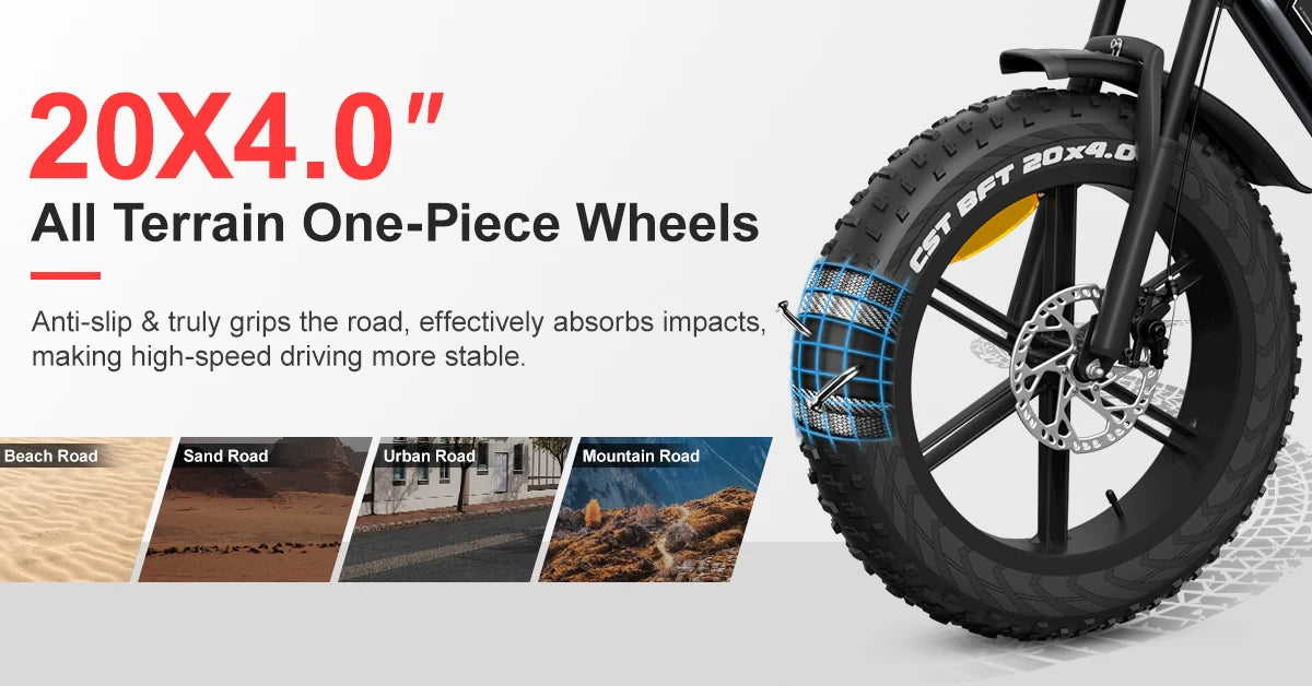 🚲【HIGH PRECISION ENGINEERING DESIGN】— This electric bicycle frame is made of high-carbon steel, easy to climb 30 degrees — Tire: 20" * 4.0 snow tyrep; Enhanced anti-skidding and wear-resistant tires, adapt to snow, sand and other complex topography. Adapt to all terrain, snow road, sand road, gravel road. Front and rear mechanical disc brakes bring you peace of mind.