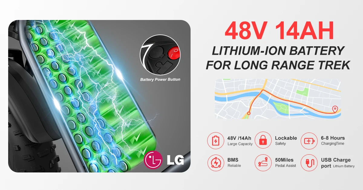 🚲【Removable Battery】— Fat Tire Electric Bike Comes with 48V/14AH larger-capacity lithium batteries and longer lifetime, covering a range of 20-40miles per full charge. Removable battery, convenient to bring home or office to recharge.